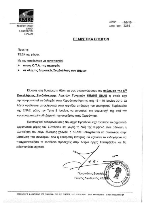Τη σκυτάλη από την ΕΝΑΕ πήρε η ΚΕΔΚΕ και με επιστολή της προς όλες της ΤΕΔΚ της χώρας ανακοινώσε την ακύρωση της 5ης Πανελλήνιας Συνδιάσκεψης Αιρετών Γυναικών, που είχε προγραμματιστεί να διεξαχθεί στη Χερσόνησο της Κρήτης.
