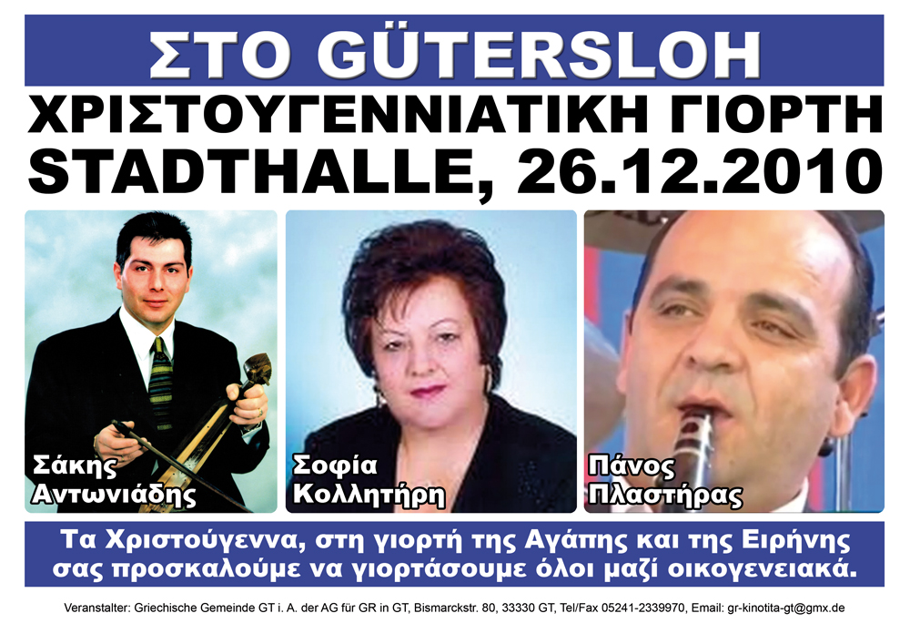 ΔΙΟΡΓΑΝΩΣΗ: ΕΛΛΗΝΙΚΗ ΚΟΙΝΟΤΗΤΑ GÜTERSLOH, Bismarckstr. 80, 33330 Gütersloh, τηλ. 05241-2339836, τηλ/φαξ: 05241-2339970, gr-kinotita-gt@gmx.de, με εντολή και βοήθεια της ΣΥΝΕΡΓΑΣΙΑΣ Συλλόγων & Φορέων για τον Ελληνισμό στο Gütersloh (ΑG f. GR in GT).