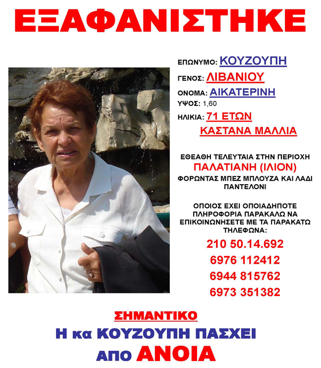 Αγωνία για την οικογένεια της 71χρονης Κατερίνας Κουζούπη, τα ίχνη της οποίας χάθηκαν χθες το μεσημέρι, όταν έφυγε από το σπίτι της στο Ίλιον.Ο σύζυγος και τα παιδιά της ηλικιωμένης κάνουν έκκληση σε όποιον γνωρίζει κάτι να επικοινωνήσουν μαζί τους, αφού η 71χρονη πάσχει από αλτσχάιμερ και αδυνατεί να επιστρέψει μόνη στο σπίτι της.