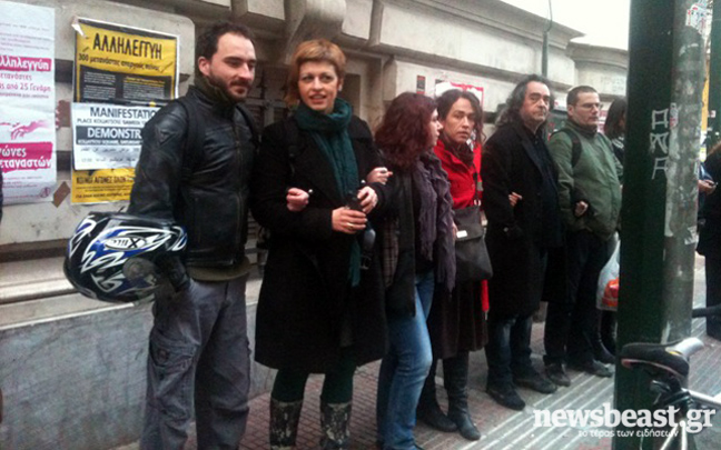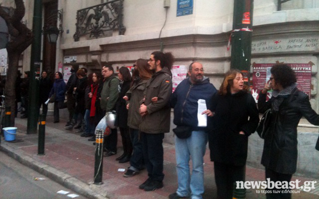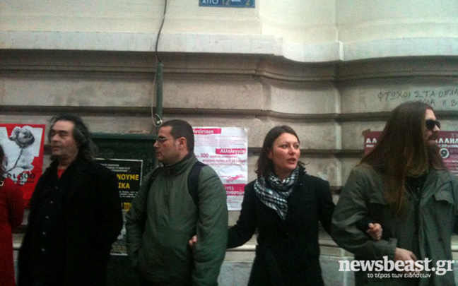 Ανθρώπινη αλυσίδα γύρω από το Μέγαρο Υπατία σχημάτισαν μετά τις 5 το απόγευμα περίπου 30 μέλη απο τους γνωστούς αλληλέγγυους των παράνομων λαθρομεταναστών που ζητούν την νομιμοποίηση της παρανομίας τους.