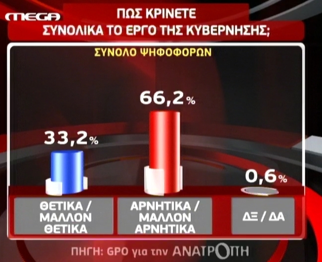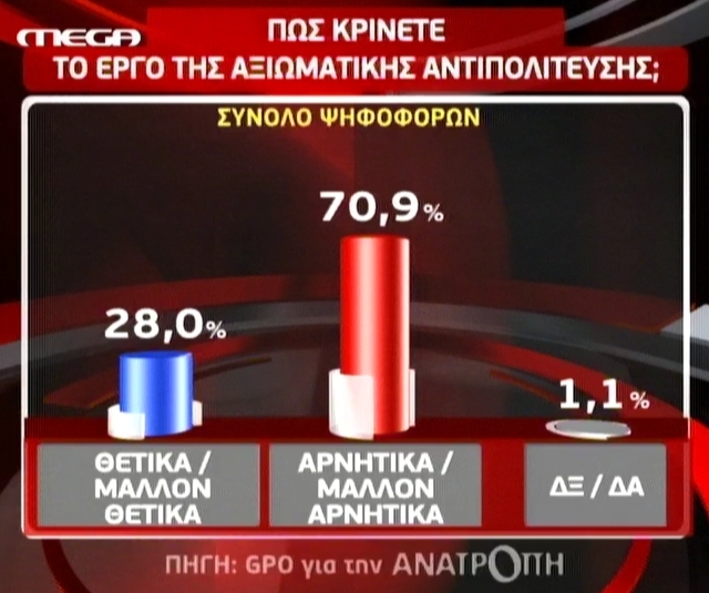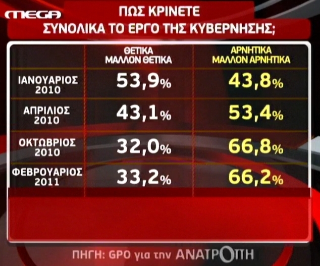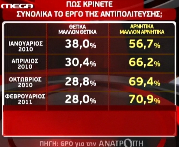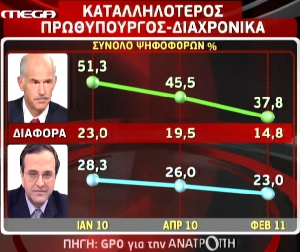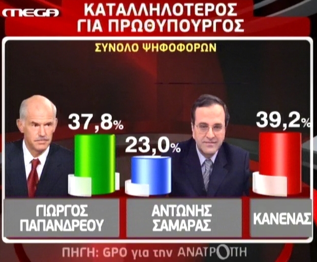 Όπως δείχνει η δημοσκόπηση οι πολίτες γυρνούν την πλάτη στα δύο μεγάλα κόμματα καθώς διαχρονικά αυξάνεται με γεωμετρική πρόοδο το σύνολο των αρνητικών εκτιμήσεων των πολιτών ως προς την αξιολόγησή τους. Καταλληλότερος πρωθυπουργός παραμένει ο Γιώργος Παπανδρέου με 37,8% έναντι του Αντώνη Σαμαρά με 23%, ωστόσο την πρώτη θέση με 39,2% καταλαμβάνει για πρώτη φορά ο κανένας.