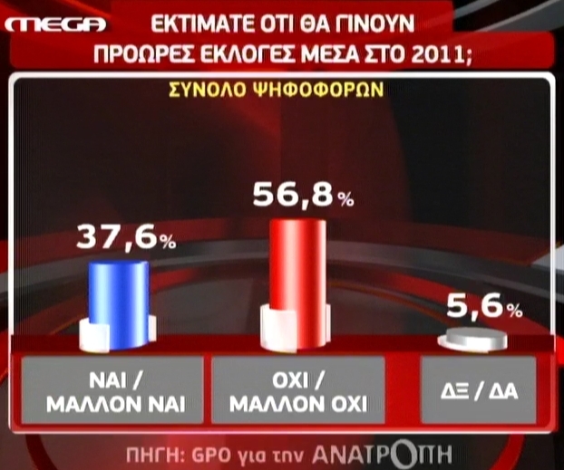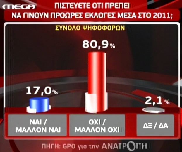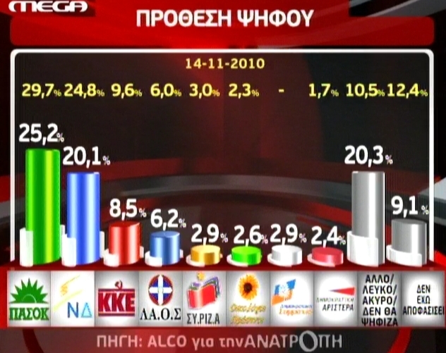 Παρά τη φθορά που έχει υποστεί το κυβερνών κόμμα, το ΠΑΣΟΚ παραμένει πρώτο κόμμα με 25,2% με τη Νέα Δημοκρατία να έρχεται δεύτερο κόμμα με 20,1%. Ακολουθεί το ΚΚΕ με 8,5%, ο ΛΑ.Ο.Σ. 6,5%, ο ΣΥΡΙΖΑ με 2,9%, οι Οικολόγοι με 2,6%, η Δημοκρατική Συμμαχία 2,9%, η Δημοκρατική Αριστερά με 2,4%. Υψηλό είναι το ποσοστό και αυτών που δεν έχουν αποφασίσει τι θα ψηφίσουν ή θα ψηφίσουν άκυρο ή λευκό καθώς ανέρχεται στο 20,3%.