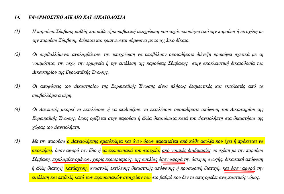 "Με την παρούσα ο Δανειολήπτης αμετάκλητα και άνευ όρων παραιτείται από κάθε ασυλίαπου έχει ή πρόκειται να αποκτήσει, όσον αφορά τον ίδιο ή τα περιουσιακά του στοιχεία, από νομικές διαδικασίες σε σχέση με την παρούσα Σύμβαση, περιλαμβανομένων, χωρίς περιορισμούς, της ασυλίας όσον αφορά την άσκηση αγωγής, δικαστική απόφαση ή άλλη διαταγή, κατάσχεση, αναστολή εκτέλεσης δικαστικής απόφασης ή προσωρινή διαταγή, καιόσον αφορά την εκτέλεση και επιβολή κατά των περιουσιακών στοιχείων του στο βαθμό που δεν το απαγορεύει αναγκαστικός νόμος"
