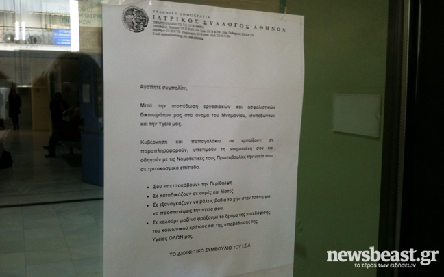 Στην είσοδο υπάρχουν λίστες των γιατρών (ΟΠΑΔ, ΟΑΕΕ) που καλούνται να καλύψουν τις ανάγκες των ασφαλισμένων του ΙΚΑ, λόγω των απεργιών, αλλά έχουν να ενημερωθούν από το 2005!