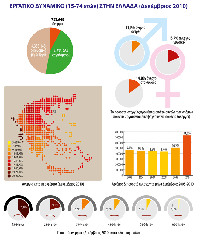 Σύμφωνα με τα στοιχεία της Ελληνικής Στατιστικής Αρχής οι άνεργοι (παρά την εορταστική εμπορική κίνηση) ανήλθαν τον περασμένο Δεκέμβριο σε 733.645 άτομα και αυξήθηκαν κατά 228.535 άτομα σε σχέση με τον Δεκέμβριο 2009 (αύξηση 45,2%) και κατά 41.068 άτομα σε σχέση με τον Νοέμβριο 2010 (αύξηση 5,9%).