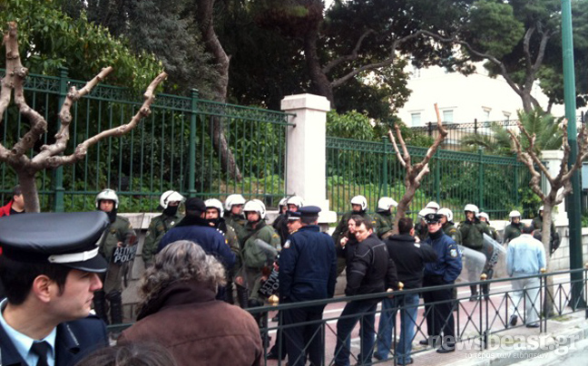 Ένταση επικρατεί έξω από τη Βουλή όπου τα ΜΑΤ προσπάθησαν να απωθήσουν μέλη της επιτροπής Πρωτοβουλία Αλληλεγγύης τα οποία είχαν συγκεντρωθεί εκεί προκειμένου να δοθεί συνέντευξη Τύπου για τους απεργούς πείνας.