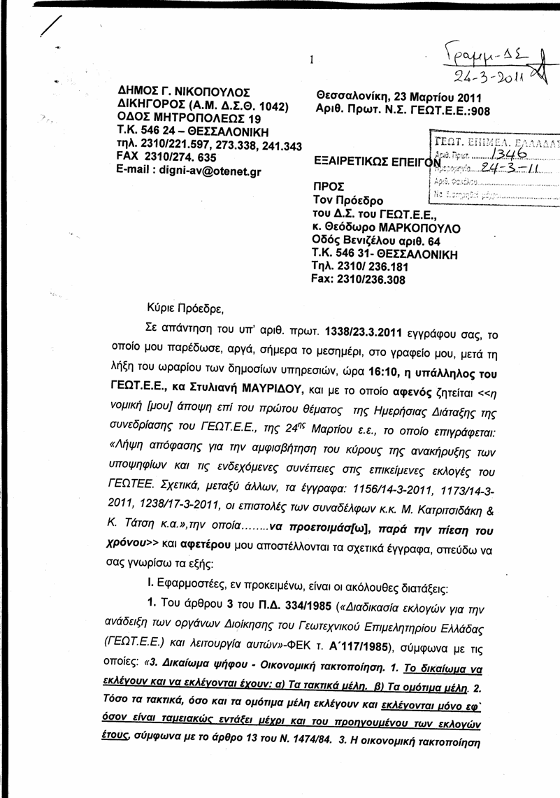 2. Του άρθρου 4 του Π.Δ. 334/1985 («Διαδικασία εκλογών για την ανάδειξη των οργάνων Διοίκησης του Γεωτεχνικού Επιμελητηρίου Ελλάδας (ΓΕΩΤ.Ε.Ε.) και λειτουργία αυτών»-ΦΕΚ τ. Α΄117/1985, σύμφωνα με τις οποίες: «4. Υποβολή υποψηφιοτήτων - Ανακήρυξη υποψηφίων. 1. Υποψηφιότητες για την εκλογή αντιπροσώπων ή μελών του Διοικητικού Συμβουλίου και των Διοικουσών Επιτροπών, υποβάλλονται από συνδυασμούς ή μεμονωμένους υποψήφιους με δήλωση τους προς το Διοικητικό Συμβούλιο του ΓΕΩΤ.Ε.Ε., μέχρι και την τεσσαρακοστή (40) ημέρα πριν από την ημερομηνία διεξαγωγής των εκλογών.