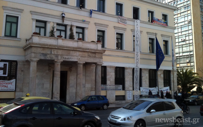 Συνεχίζεται, για τέταρτη μέρα, η κατάληψη του δημαρχείου Αθηνών από συμβασιούχους.