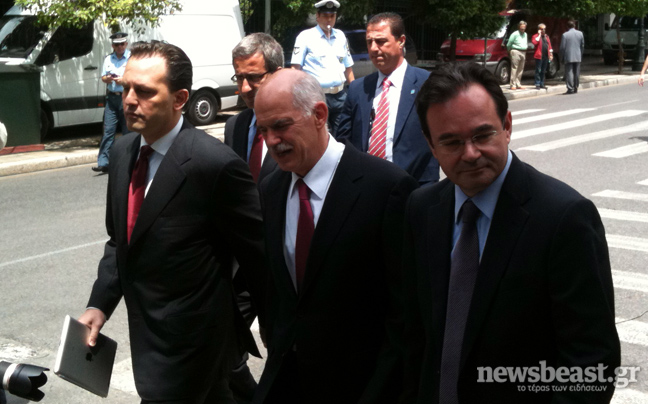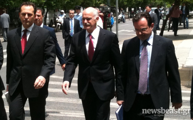 Με τη συνοδεία του Γ. Παπακωνσταντίνου, του Δ. Δρούτσα και του κυβερνητικού εκπροσώπου, ο πρωθυπουργός έφτασε στις 12.32 στο συμβούλιο των πολιτικών αρχηγών, καλύπτοντας πεζός τη μικρή απόσταση από το Μέγαρο Μαξίμου.