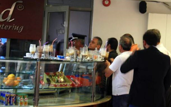 Οι διαδηλωτές κινητοποιήθηκαν μέσω του Facebook και περίμεναν με πλακάτ, σφυρίχτρες και σκληρά συνθήματα (κατά της τρόικας, του Μνημονίου και της κατασπατάλησης του δημοσίου χρήματος), τους προσκεκλημένους της εκδήλωσης.