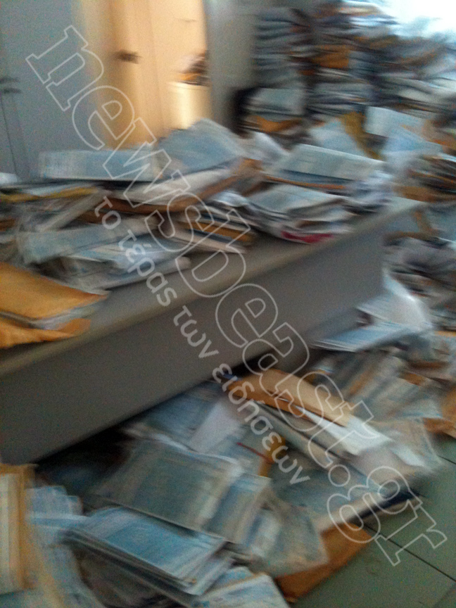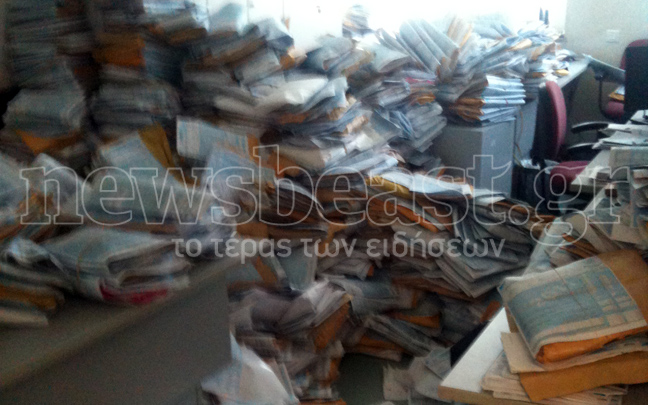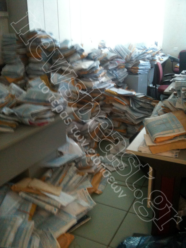 Στο δωμάτιο, που βλέπετε, η πόρτα του οποίου είναι ξεκλείδωτη (!) και πρόσβαση έχει ο οποιοσδήποτε, είναι παρατημένα εκατοντάδες έντυπα φορολογικών δηλώσεων. Ο αριθμός τους δεν μειώνεται, καθώς οι εφοριακοί δεν προλαβαίνουν να τις επεξεργαστούν. Ο λόγος;