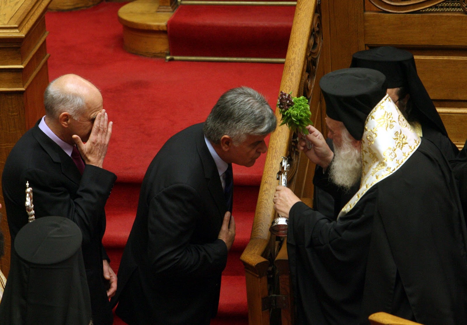 Στο πρόσωπο του πρωθυπουργού έριξε κατά λάθος τον αγιασμό ο Αρχιεπίσκοπος και αυτός... σκουπίστηκε!