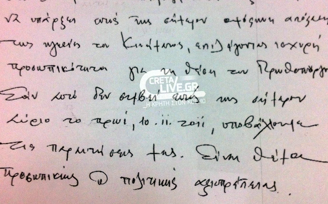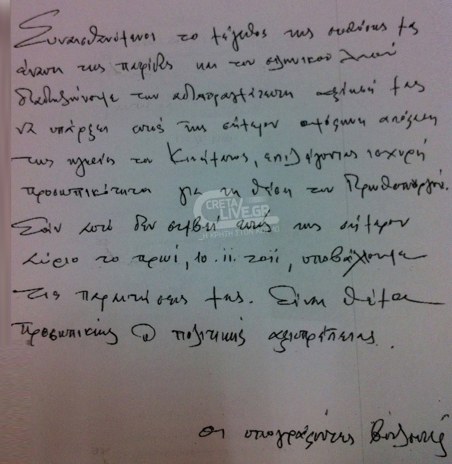 Σύμφωνα με το «Cretalive.gr» ήταν μάλιστα τέτοια η αγωνία των βουλευτών να προλάβουν τις καταιγιστικές εξελίξεις, ώστε μετά τις νυχτερινές συναντήσεις, κατέληξαν σε μία χειρόγραφη επιστολή, την οποία δε δακτυλογράφησαν, μη ρισκάροντας να χάσουν πολύτιμο - ίσως και καθοριστικό - χρόνο...