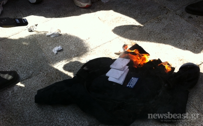 Στη συνέχεια, και ενώ ο αστυνομικός φέρεται να φυγαδεύθηκε τραυματισμένος, οι διαδηλωτές πήραν τα ρούχα του και τα κρέμασαν σε δέντρο στην πλατεία Συντάγματος. Σύμφωνα με πληροφορίες, ο αστυνομικός έχει υποστεί κάταγμα στη μύτη, ενώ από τη ζώνη λείπει το υπηρεσιακό του περίστροφο. Δεν έχει γίνει γνωστό εάν εκλάπη ή αν δεν οπλοφορούσε καν.
