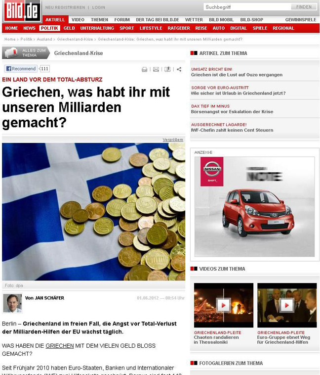 Ο τίτλος του άρθρου του στην ηλεκτρονική έκδοση της εφημερίδα είναι ««Έλληνες, τι έχετε κάνει με τα δισεκατομμύρια μας;», με τον Jan Schäfer να προσπαθεί να εξηγήσει στους Γερμανούς πού πήγαν τα λεφτά από την δανειοδότηση της Ελλάδας.