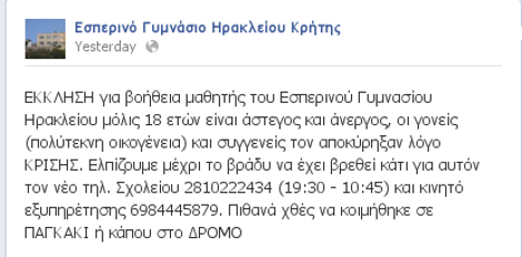 «ΕΚΚΛΗΣΗ για βοήθεια μαθητής του Εσπερινού Γυμνασίου Ηρακλείου μόλις 18 ετών είναι άστεγος και άνεργος, οι γονείς (πολύτεκνη οικογένεια) και συγγενείς τον αποκύρηξαν λόγο ΚΡΙΣΗΣ. Ελπίζουμε μέχρι το βράδυ να έχει βρεθεί κάτι για αυτόν τον νέο τηλ. Σχολείου 2810222434 (19:30 - 10:45) και κινητό εξυπηρέτησης 6984445879. Πιθανά χθές να κοιμήθηκε σε ΠΑΓΚΑΚΙ ή κάπου στο ΔΡΟΜΟ».