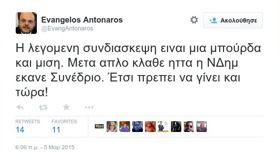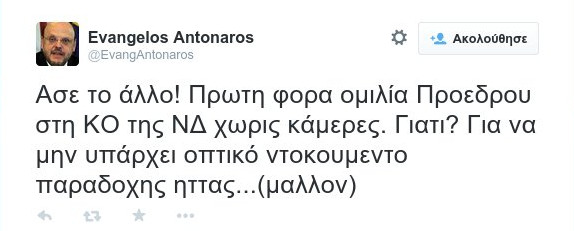 «Άσε το άλλο! Πρώτη φορά ομιλία Προέδρου στη ΚΟ της ΝΔ χωρίς κάμερες. Γιατί? Για να μην υπάρχει οπτικό ντοκουμέντο παραδοχής ήττας...(μάλλον)».