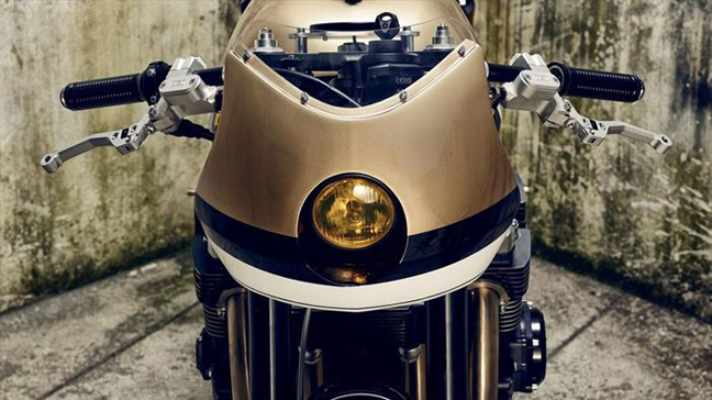 Επιλέγοντας έναν χρωματισμό που θυμίζει το θρυλικό αγωνιστικό σχέδιο του King Kenny Roberts, αντικατέστησαν το κίτρινο με χρυσό και προχώρησαν σε μια συλλογή από σπουδαία επώνυμα περιφερειακά. Το ανεστραμμένο πιρούνι προέρχεται από R1, τα δύο αμορτισέρ από την φημισμένη Ohlins, λεβιέδες, μανέτες και μαρσπιέ από την LSL, σωληνάκια υψηλής σε φρένα και συμπλέκτη από τη Hel Performance, ψηφιακό όργανο της Motoscope και βέβαια την απίθανη εξαπίστονη δαγκάνα της ISR μπροστά με δίσκους 340 χιλιοστών!