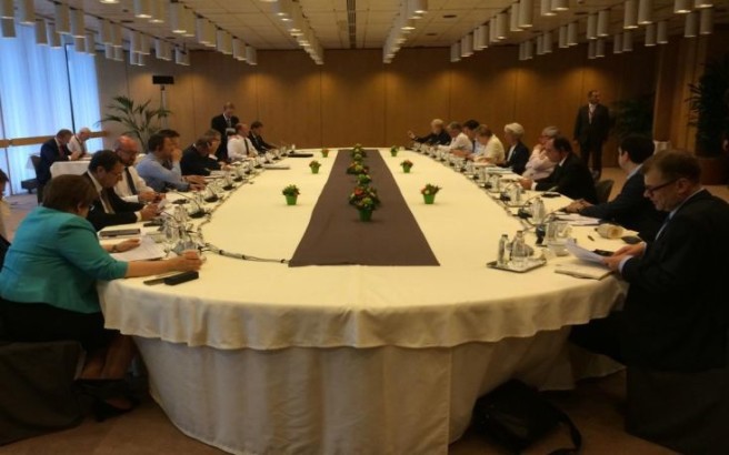 Κοντά στον γάλλο πρόεδρο Φρανσουά Ολάντ κάθεται ο πρωθυπουργός Αλέξης Τσίπρας, όπως φαίνεται στη φωτογραφία που δόθηκε στη δημοσιότητα από τη Σύνοδο Κορυφής των ηγετών της ευρωζώνης που βρίσκεται αυτή την ώρα σε εξέλιξη. Απέναντί του βρίσκεται ο κύπριος πρόεδρος Νίκος Αναστασιάδης. Από τα δεξιά του κ. Ολάντ κάθονται με τη σειρά οι Γιούνκερ, Λαγκάρντ, Μέρκελ και Ντάισελμπλουμ.