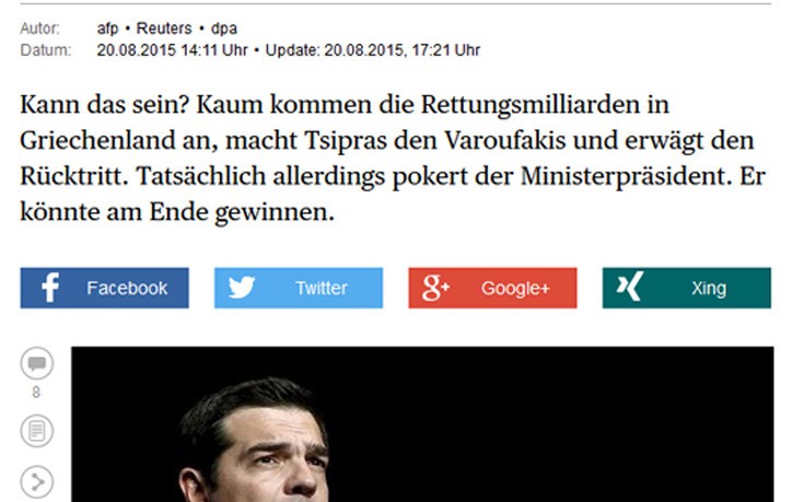 «Ο Έλληνας πρωθυπουργός Αλέξης Τσίπρας «προτείνει τη διεξαγωγή πρόωρων εκλογών την 20η Σεπτεμβρίου» γράφει η εφημερίδα Le Point στη διαδικτυακή της έκδοση, επικαλούμενη το Αθηναϊκό Πρακτορείο Ειδήσεων.