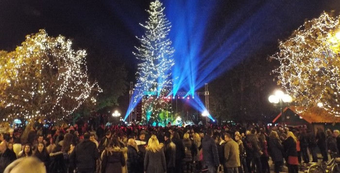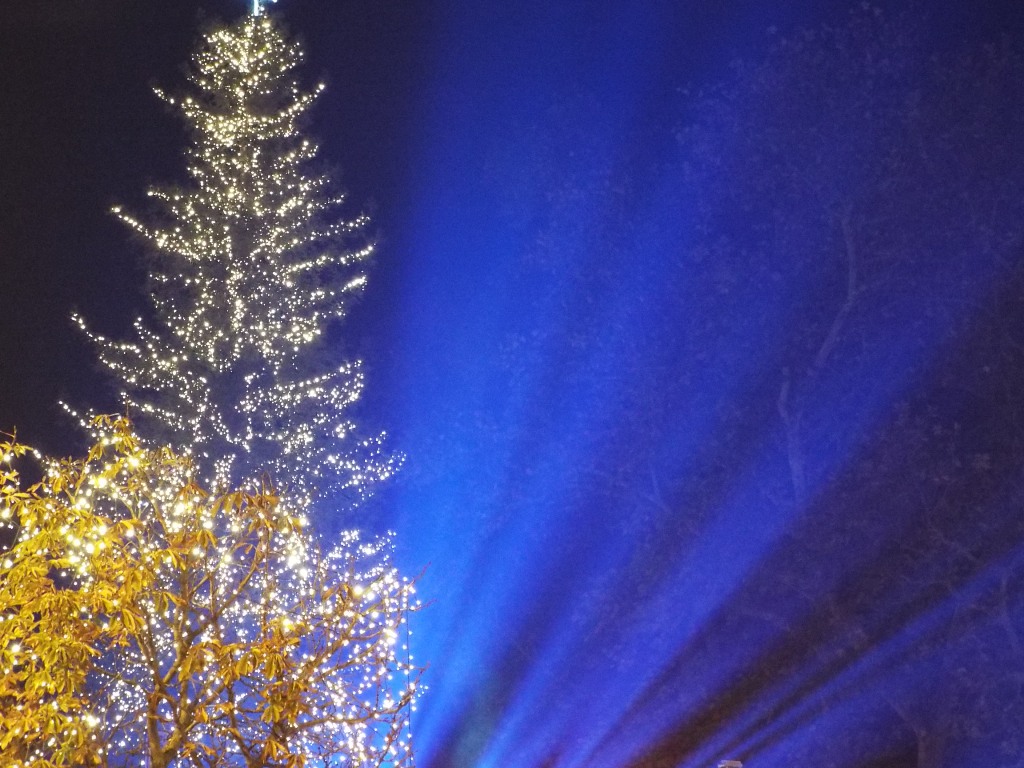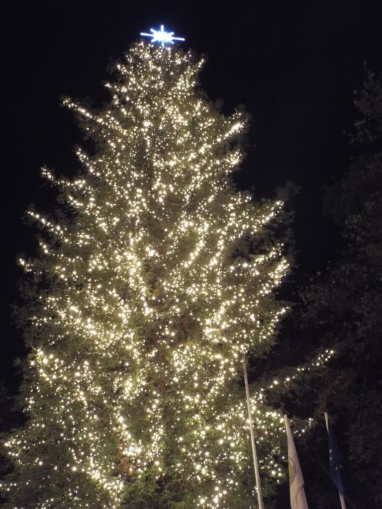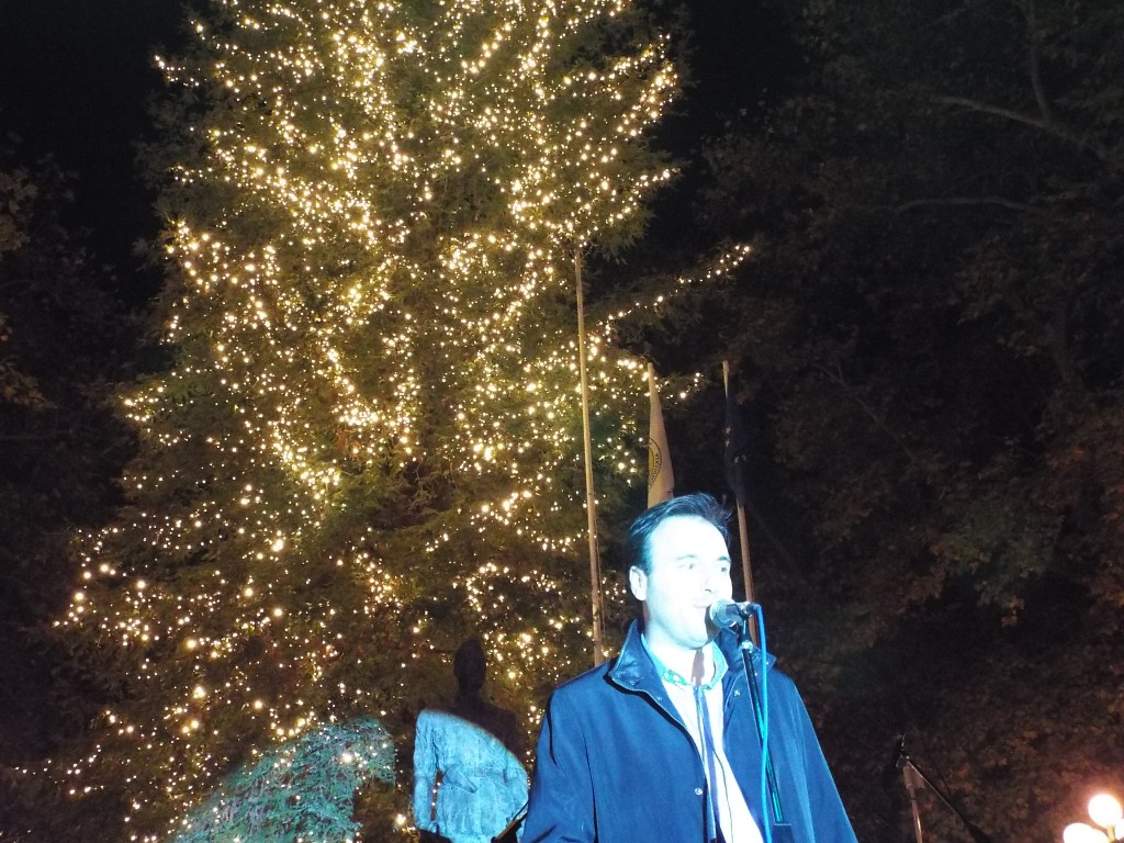 Η φωταγώγηση του δέντρου, στην κεντρική πλατεία της πόλης, έγινε στις 7 το απόγευμα, όπως είχε προγραμματιστεί, από τον δήμαρχο Τρικκαίων Δημήτρη Παπαστεργίου, ο οποίος επισήμανε λίγο πριν πατήσει το κουμπί, ότι τα Τρίκαλα, δικαιολογημένα αποτελούν «το κέντρο των εορταστικών εκδηλώσεων σε όλη την Ελλάδα», όπως και ότι όλο αυτό είναι αποτέλεσμα μιας μεγάλης προσπάθειας, που στηρίζεται από τον κόσμο. «Φέτος έχουμε ετοιμάσει έναν εξαιρετικό Μύλο των Ξωτικών, φέτος έχουμε τους φουρναραίους και τους ποντικαραίους, φέτος έχουμε και πολλά άλλα πράγματα στην πόλη μας, και θέλουμε και εμείς αλλά και όσοι μας επιλέξουν φέτος για να περάσουν εδώ τα Χριστούγεννα και την αλλαγή του χρόνου, να περάσουν υπέροχα», είπε, ενώ αναφερόμενος στην φωταγώγηση του δέντρου, μίλησε για το συμβολισμό του, λέγοντας: «Είναι το μεγαλύτερο, το πιο ψηλό φυσικό δέντρο σε όλη την Ελλάδα. Ένα δέντρο το οποίο πρέπει να σας θυμίσω ότι πέρασε πολλά και συμβολίζει κάτι. Πριν από μια δεκαετία περίπου, με τις μεγάλες παγωνιές είχε φτάσει στα όρια του, κατάφερε όμως, αντιστάθηκε, επανήλθε, ψηλώνει κι άλλο και νομίζω πως πρέπει να στηριχθούμε στην ιστορία του και να συνεχίσουμε παρά τις δυσκολίες».