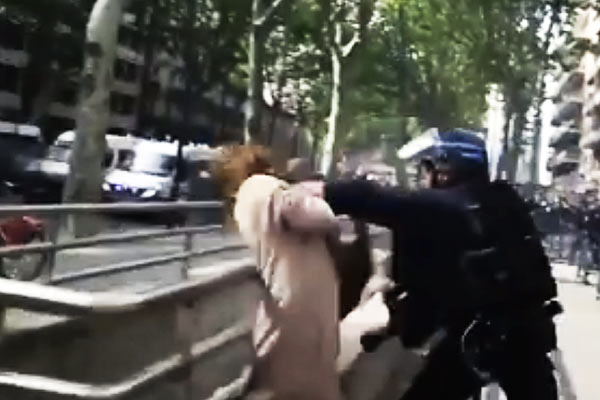 πετά βίαια γυναίκα διαδηλώτρια πρώτα πάνω σε κάγκελα και μετά στο έδαφος. Σύμφωνα με την σελίδα Occupy France, όπου αναρτήθηκε το βίντεο, η γυναίκα που δέχτηκε την βάρβαρη επίθεση των δυνάμεων καταστολής ήθελε να δώσει ένα πουλόβερ σε φίλο της που συνελήφθη από την αστυνομία.