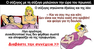 – Και να σου πω και κάτι; Δεν είσαι και πολύ καλή στο κρεβάτι! και φεύγει για τη δουλειά του....