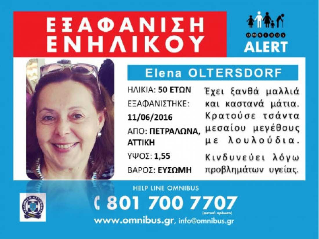 Τραγικό επίλογο είχε η εξαφάνιση της 50χρονης, Ελενας Ολντέρσντορφ, της οποίας τα ίχνη είχαν χαθεί για παραπάνω από πέντε μήνες. Η άτυχη γυναίκα είχε εξαφανιστεί στις αρχές του περασμένου καλοκαιριού και έκτοτε αρχές και φίλοι την αναζητούσαν. Η τελευταία εξέλιξη και η πιο δραματική....