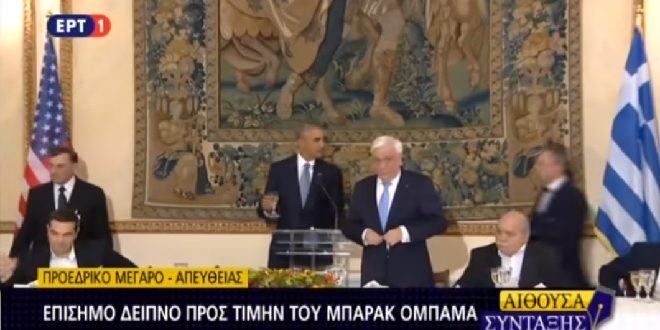 Μια ακόμη αμήχανη στιγμή υπήρξε κατά την επίσκεψη του Ομπάμα στη χώρα μας. Αυτή τη φορά στο δείπνο προς τιμήν του Αμερικανού προέδρου, όταν ο Μπάρακ Ομπάμα σηκώνεται για να κάνει πρόποση. Ωστόσο, ο Αλέξης Τσίπρας με…