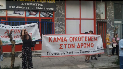 την οποία η τράπεζα είχε αποκτήσει μετά από εκπλειστηριασμό της το 2012.  Στην συγκέντρωση, που πραγματοποιήθηκε μπροστά στο σπίτι της οικογένειας Σκοπελίτη (Βιθυνίας και Φιλαδελφείας), παρευρέθηκαν δεκάδες εκπρόσωποι των συλλογικοτήτων της περιοχής, αλλά και πάρα πολλοί γείτονες της οικογένειας και κάτοικοι της περιοχής.  Επίσης στην συγκέντρωση παρευρέθηκε μαζικό κλιμάκιο στελεχών και μελών της ΛΑ.Ε, με επικεφαλής τους Δημ. Στρατούλη και Στ. Λεουτσάκο, μέλη της Πολιτικής Γραμματείας.  Στη συγκέντρωση χαιρέτησε εκπρόσωπος του Κινήματος Ισπανών Πολιτών κατά των εξώσεων και των πλειστηριασμών.  Στη συνέχεια ακολούθησε πορεία στους δρόμους της Κοκκινιάς, η οποία κατέληξε στην πλατεία Δαβάκη (Περιβολάκι), όπου ακούστηκαν συνθήματα κατά των εξώσεων και των πλειστηριασμών.  Κατά τη διάρκεια της κινητοποίησης οι Δημ. Στρατούλης και Στ. Λεουτσάκος έκαναν της εξής δήλωση :  “Είμαστε εδώ σήμερα για να διαμηνύσουμε στην κυβέρνηση, σε όλο το μνημονιακό κατεστημένο, στους δανειστές, στις τράπεζες, στα “κοράκια” και στα κερδοσκοπικά funds ότι τα σχέδια τους για αρπαγή και λεηλασία των σπιτιών και της περιουσίας των λαϊκών νοικοκυριών και των κατεστραμμένων μικρομεσαίων επιχειρήσεων δεν θα περάσουν και θα ακυρωθούν στην πράξη.  Είμαστε στο πλευρό της οικογένειας που οδηγείται σε έξωση από το σπίτι της που το έχασε σε πλειστηριασμό από την Eurobank και θα στηρίξουμε με την ενεργή παρουσία μας τις κινητοποιήσεις και δράσεις του κινήματος κατά των πλειστηριασμών, ώστε να μην πεταχτεί στο δρόμο.  Οι πλειστηριασμοί και οι εξώσεις λαϊκών νοικοκυριών από τα σπίτια τους θα γίνουν η ταφόπετρα των μνημονιακών πολιτικών, της κυβέρνησης που τα εφαρμόζει και όλων των μνημονιακών δυνάμεων που τις στηρίζουν”.  ΠΗΓΗ: bankstersae.blogspot.gr