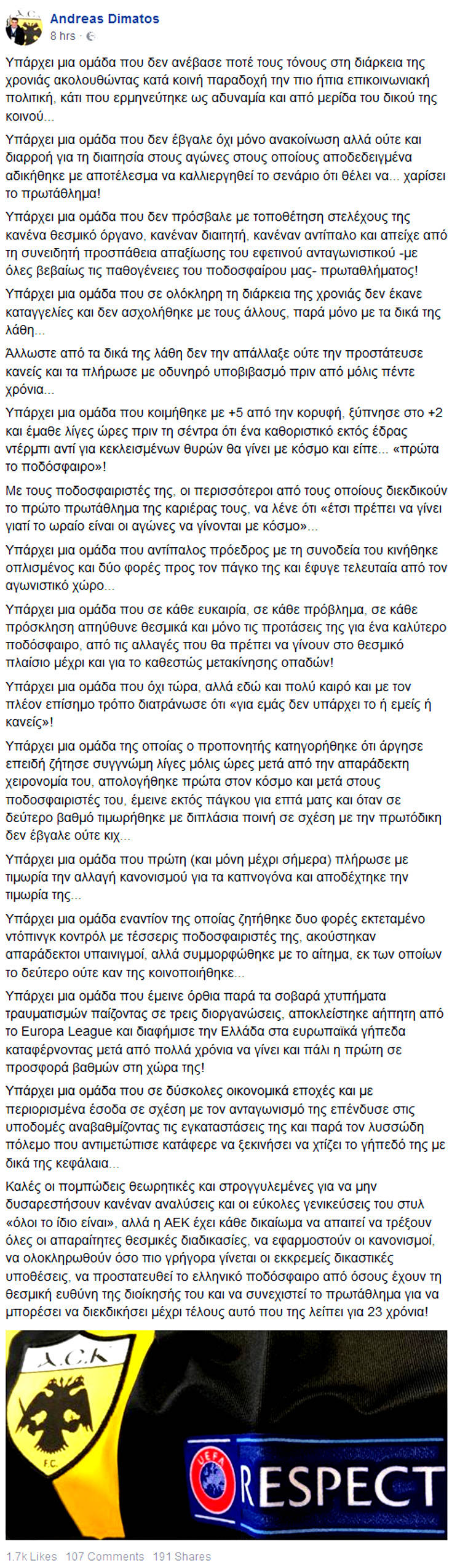 Καλές οι πομπώδεις θεωρητικές και στρογγυλεμένες για να μην δυσαρεστήσουν κανέναν αναλύσεις και οι εύκολες γενικεύσεις του στυλ "όλοι το ίδιο είναι", αλλά η ΑΕΚ έχει κάθε δικαίωμα να απαιτεί να τρέξουν όλες οι απαραίτητες θεσμικές διαδικασίες, να εφαρμοστούν οι κανονισμοί, να ολοκληρωθούν όσο πιο γρήγορα γίνεται οι εκκρεμείς δικαστικές υποθέσεις, να προστατευθεί το ελληνικό ποδόσφαιρο από όσους έχουν τη θεσμική ευθύνη της διοίκησής του και να συνεχιστεί το πρωτάθλημα για να μπορέσει να διεκδικήσει μέχρι τέλους αυτό που της λείπει για 23 χρόνια!».