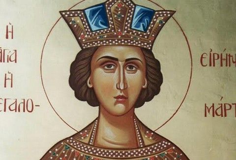 Η Εκκλησία σήμερα, 05 Μαΐου τιμά τη μνήμη της Αγίας Ειρήνης της Μεγαλομάρτυρος. Η αγία Ειρήνη, της οποίας το αρχικό όνομα ήταν Πηνελόπη, γεννήθηκε στη πύλη Μαδεδλών της Περσίας και γονείς της ήταν ο έπαρχος Λικίνιος και η ευγενής Λικινία. Σε πολύ μικρή ηλικία άρχισε την γραμματική της εκπαίδευση κοντά σε έναν από τους πλέον σοφούς διδασκάλους της εποχής της, τον Απελλιανό, ο οποίος δίδαξε στη Πηνελόπη τη θύραθεν σοφία, ενώ την χριστιανική πίστη την διδάχθηκε από μια χριστιανή υπηρέτρια του πατέρα της....Όταν τελείωσε η κατήχηση βαπτίσθηκε χριστιανή και έλαβε το όνομα Ειρήνη. Όταν ο Λικίνιος έμαθε ότι η κόρη του έγινε χριστιανή διέταξε να τη δέσουν στα πόδια ενός άγριου αλόγου για να σκοτωθεί. Αλλά από θαύμα το άλογο στράφηκε εναντίον του και σκότωσε εκείνον. Μεγάλη ήταν η σύγχυση των παραβρισκομένων, αλλά η αγία τους καθησύχασε και αφού προσευχήθηκε με θέρμη, ο πατέρας της αναστήθηκε. Αμέσως βαπτίσθηκαν όλοι χριστιανοί. Στη συνέχεια η αγία Ειρήνη περιόδευσε σε αρκετά μέρη όπου, δίδαξε το λόγο του Θεού και έκανε πολλά θαύματα. Στο τέλος η αγία Ειρήνη αποσύρθηκε σε ένα ερημικό μέρος έξω από την Έφεσο όπου έζησε με προσευχή και άσκηση. Στο Συναξάρι της αναφέρεται ότι στην Έφεσο η αγία Ειρήνη βρήκε μία λάρνακα, στην οποία δεν είχε ως τότε ενταφιασθεί κανένας, μπήκε μέσα σε αυτήν και κοιμήθηκε με ειρήνη. Πριν δε από την κοίμησή της η Αγία Ειρήνη είχε δώσει εντολή να μην μετακινήσει κανένας την ταφόπετρα, με την οποία θα σκέπαζε τη λάρνακα ο δάσκαλός της Απελλιανός, προτού περάσουν τέσσερις ημέρες. Μετά όμως από δύο ημέρες επισκέφθηκαν τον τάφο ο Απελλιανός και οι άλλοι, οι οποίοι είδαν ότι η ταφόπετρα ήταν σηκωμένη και η λάρνακα κενή. Κατά τα δυτικά Μαρτυρολόγια η Αγία Ειρήνη μαρτύρησε στη Θεσσαλονίκη, αφού ρίχθηκε στην πυρά ενώ κατά το Μηνολόγιον του αυτοκράτορα Βασιλείου Β’, η Αγία Ειρήνη τελειώθηκε μαρτυρικά δι’ αποκεφαλισμού. Ἀπολυτίκιον Ἦχος δ’. Ταχὺ προκατάλαβε. Εἰρήνης τὸν ἄρχοντα, ἰχνηλατοῦσα σεμνή, εἰρήνης ἐπώνυμος, δι’ ἐπιπνοίας Θεοῦ, ἐδείχθης πανεύφημε, σὺ γὰρ τοῦ πολέμου, τᾶς ἐνέδρας φυγοῦσα, ἤθλησας ὑπὲρ φύσιν, ὡς παρθένος φρονίμη, διὸ Μεγαλομάρτυς Εἰρήνη, εἰρήνην ἠμὶν αἴτησαι.