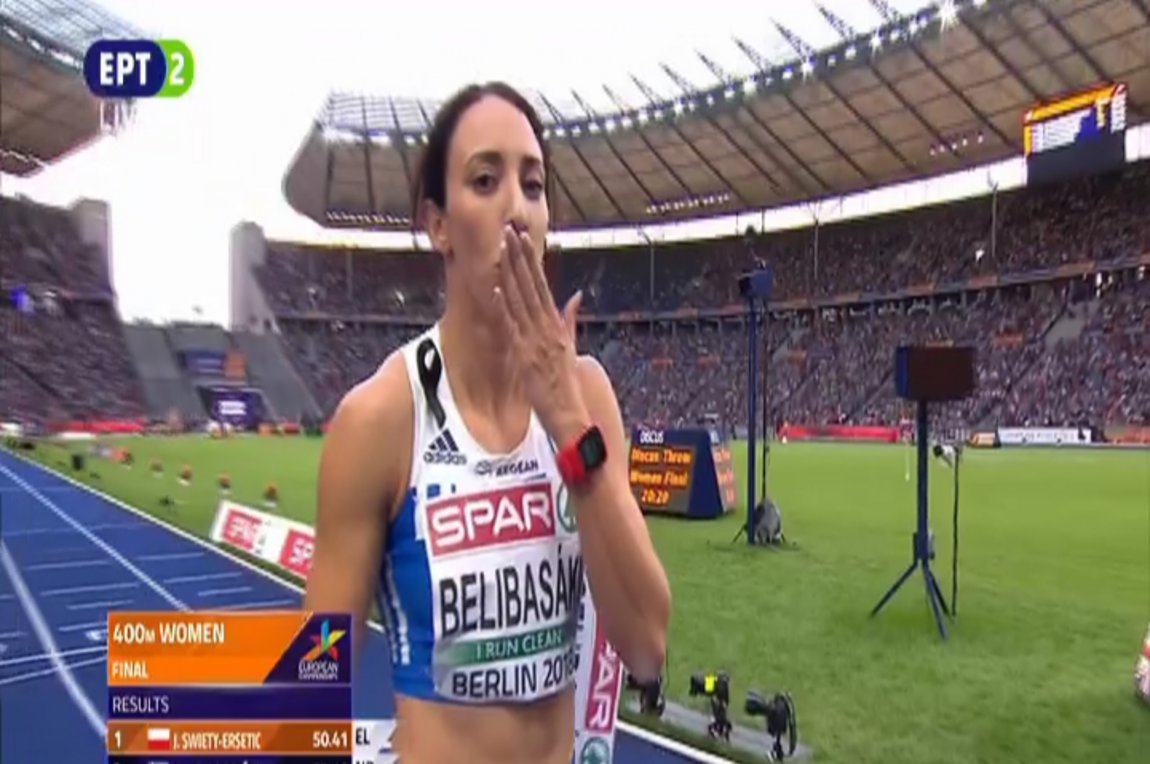 Η Μαρία Μπελιμπασάκη όμως διευκρίνισε πως παρότι η Ελλάδα περνάει τόσο δύσκολα δεν γίνεται να τα παρατήσουμε ως λαός. «Τα φιλιά μου στην Ελλάδα, μην τα παρατάτε», σχολίασε η Μπελιμπασάκη που ήταν φορτισμένη συναισθηματικά και έντονα συγκινημένη. «Μπήκα στην κούρσα για να νικήσω» «Προσπάθησα πολύ. Αισθανόμουν καλά πριν τον αγώνα και μπήκα για να κερδίσω. Πάλεψα όπως κάνω σε όλες τις κούρσες μου. Στα τελευταία μέτρα έχασα το βηματισμό μου κι έπεσα. Όλη τη χρονιά οι εμφανίσεις μου έδειχναν ότι θα τα κατάφερνα εδώ. Είμαι πολύ χαρούμενη. Ευχαριστώ τον προπονητή μου Κώστα Ηλία, τους γονείς μου, το ιατρικό επιτελείο του ΣΕΓΑΣ που με βοήθησαν αποφασιστικά σε έναν τραυματισμό που είχα, ευχαριστώ όλους. Εύχομαι σε όλο τον κόσμο υγεία. Αισθάνομαι μεγάλη λύπη για την κατάσταση που επικρατεί στην Ελλάδα, ο κόσμος υποφέρει», είπε η Μαρία Μπελιμπασάκη.