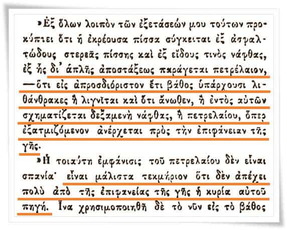 » Ενταύθα δε η παρουσία του πετρελαίου μετά της λίαν υδρογονούχου ασφαλτώδους πίσσης οδηγεί ημάς εις το να υποθέσωμεν μετά τινος πιθανότητος την εις απροσδιόριστον βάθος ύπαρξιν λιγνιτών ή λιθανθράκων.