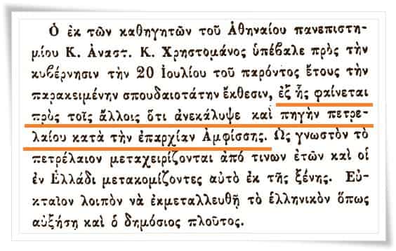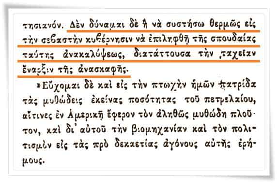 » Εύχομαι δε και εις την πτωχήν ημών πατρίδα τας μυθώδεις εκείνας ποσότητας του πετρελαίου, αίτινες εν Αμερική έφερον τον αληθώς μυθώδη πλούτον, και δι’ αυτού την βιομηχανίαν και τον πολιτισμόν εις τας προ δεκαετίας αγόνους αυτής ερήμους.»