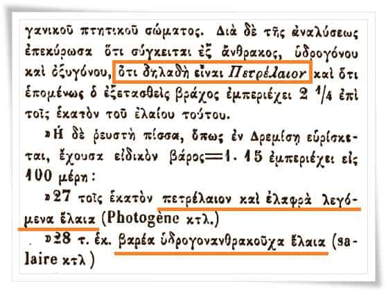 » Αλλά μετά προσοχής σπουδάσας πάντα τα συμβαίνοντα επληροφορήθην ότι δεν είναι μόνον η θερμότης, αλλ’ έτι μάλλον υγρόν τι πτητικόν ηνωμένον μετά της πίσσης, όπερ ρευστοποιεί αυτήν· διότι όσω βαθύτερον κατήλθον κατά την ανασκαφήν, τοσούτω αφθονοτέρα και ρευστοτέρα εγένετο η πίσσα, τοσούτω μάλλον επεκτάτει και η εμπυρευματική αυτής οσμή. Εις βάθος 3 ως έγγιστα μέτρων η ουσία του τιτανίτου ήτο μεστή, κεκορεσμένη, ούτως ειπείν, και έκαστον θραύσμα περιείχε πίσσαν. Και δη λαβών επί σκοπώ αναλύσεως και δοκιμασίας τεμάχιον 3 οκάδων τοιούτου τιτανολίθου, ηδυνήθην δια της αποστάξεως εις θερμοκρασίαν 180 βαθμών, εις ἥν η πίσσα δεν αποσυντίθεται, ν’ αποχωρίσω ακριβώς 27 δράμια βαθυκιτρίνου ή φαιού ρευστού, συναχθέντα εις τον υποδοχέα, εις δε τον λαιμόν του αποστακτικού σκεύους απήλαυσα προς την ουσίαν του λίθου και στερεάν πισσάλφατον. Το ρευστόν τούτο δια τρις επαναληφθείσης αποστάξεως απέβη κίτρινον και τέλους άχρουν, ζέον εις την σταθεράν θερμοκρασίαν των 112 βαθμών και έχον ειδικόν βάρος 0,88. Παρουσιάζει όθεν χαρακτήρα οργανικού πτητικού σώματος. Δια δε της αναλύσεως επεκύρωσα ότι σύγκειται εξ άνθρακος, υδρογόνου και οξυγόνου, ότι δηλαδή είναι Πετρέλαιον και ότι επομένως ο εξετασθείς βράχος εμπεριέχει 2 ¼ επί τοις εκατόν του ελαίου τούτου.