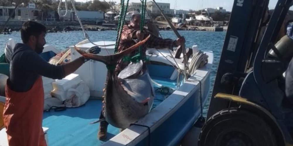 Ψαράδες στην Νάξο αλίευσαν τεράστιο ψάρι μυθικών διαστάσεων. Συγκεκριμένα έπιασαν συνολικά τέσσερα ψάρια, τα οποία κατά πάσα πιθανότητα είναι τόνοι, με συνολικό βάρος 750 κιλών! Από ότι φαίνεται αυτοί και οι οικογένειες τους θα φάνε αρκετά καλά, αφού τα ψάρια εξετάστηκαν από τις λιμενικές αρχές και βρίσκονται πλέον στη διάθεσή τους. Το ψάρι είναι τόσο μεγάλο, που προκειμένου να το μετακινήσουν αξιοποίησαν ολόκληρο μηχανισμό, αφού μάλλον ήταν αδύνατο να το κουβαλήσει άνθρωπος… Δείτε τις εικόνες: