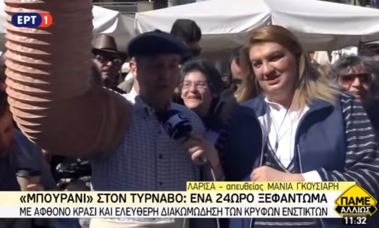 Μία μοναδική στην Ελλάδα γιορτή η οποία συνδέεται με την αρχή της Άνοιξης, τη γονιμότητα και την βλάστηση. Τα πειράγματα στις γυναίκες έδιναν κι έπαιρναν, τα χάλκινα ξεσήκωναν τους επισκέπτες με τα παραδοσιακά ακούσματα και φυσικά όπως επιτάσσει το έθιμο, άπαντες ανακάτεψαν το «Μπουρανί» την παραδοσιακή σούπα που γίνεται στο καζάνι με σπανάκι, ρύζι, τσουκνίδα και λίγο αντεράκο μαζί με ξύδι έτσι για νοστιμιά χωρίς καθόλου λάδι. Το «Μπουρανί» στον Τύρναβο κλείνει τον κύκλο των Καρναβαλικών εκδηλώσεων και έρχεται να αναταράξει τον μονότονο ρυθμό της καθημερινότητας στην πόλη. Είναι ένα λαϊκό πανηγύρι, μια αναβίωση ενός αρχαίου διονυσιακού τελετουργικού, στην ουσία η γιορτή του φαλλού, που συμβολίζει την αναπαραγωγή και την ευτεκνία. Κάτι ακόμη που έχει γίνει πια… έθιμο, είναι να ακούγεται η ευχή της συγκεκριμένης γιορτής, η οποία δεν είναι άλλη από το «Χρόνια πολλά, καλά γ@μήσ@», ζωντανά στον αέρα της ΕΡΤ! Το συγκεκριμένο βίντεο γίνεται viral… κάθε χρόνο κι έτσι έγινε και φέτος, στην εκπομπή της Δημόσιας Τηλεόρασης «Πάμε Αλλιώς», που έκανε ζωντανή σύνδεση για να ακουστεί στον αέρα η… πικάντικη ευχή! Δείτε το βίντεο: