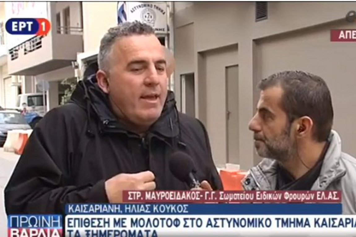 ο Γενικός Γραμματέας των Ειδικών Φρουρών της Ελληνικής Αστυνομίας, κ. Στράτος Μαυροειδάκος, μιλώντας στην εκπομπή της ΕΡΤ1 «Πρωινή Βάρδια», με τους Μάνο Νιφλή και Κώστα Αλατζά. «Δυστυχώς δικαιωνόμαστε για ακόμη μία φορά. Συνάδελφός μου φρουρός, εδώ στο τμήμα, έχει σωθεί από θαύμα, αφού του πέταξαν 10 μολότοφ και 4 γκαζάκια στη συνέχεια», είπε ο κ. Μαυροειδάκος και συνέχισε: « Ο συνάδελφός μου έχει μικρά εγκαύματα στο κεφάλι και το χέρι. Φωνάζουμε ότι διψάνε για αίμα αστυνομικού. Θέλουμε όλα τα κόμματα να σταθούν δίπλα μας και όχι να μας χρησιμοποιούν προεκλογικά».Ο κ. Μαυροειδάκος ανέφερε επίσης της μεγάλες ελλείψεις στη στελέχωση των αστυνομικών τμημάτων, υπογραμμίζοντας ότι στο τμήμα Καισαριανής την ώρα της επίθεσης βρίσκονταν 2 άτομα, αφού το περιπολικό ήταν στο περιστατικό εμπρησμού του αυτοκινήτου της δημοσιογράφου Μίνας Καραμήτρου.