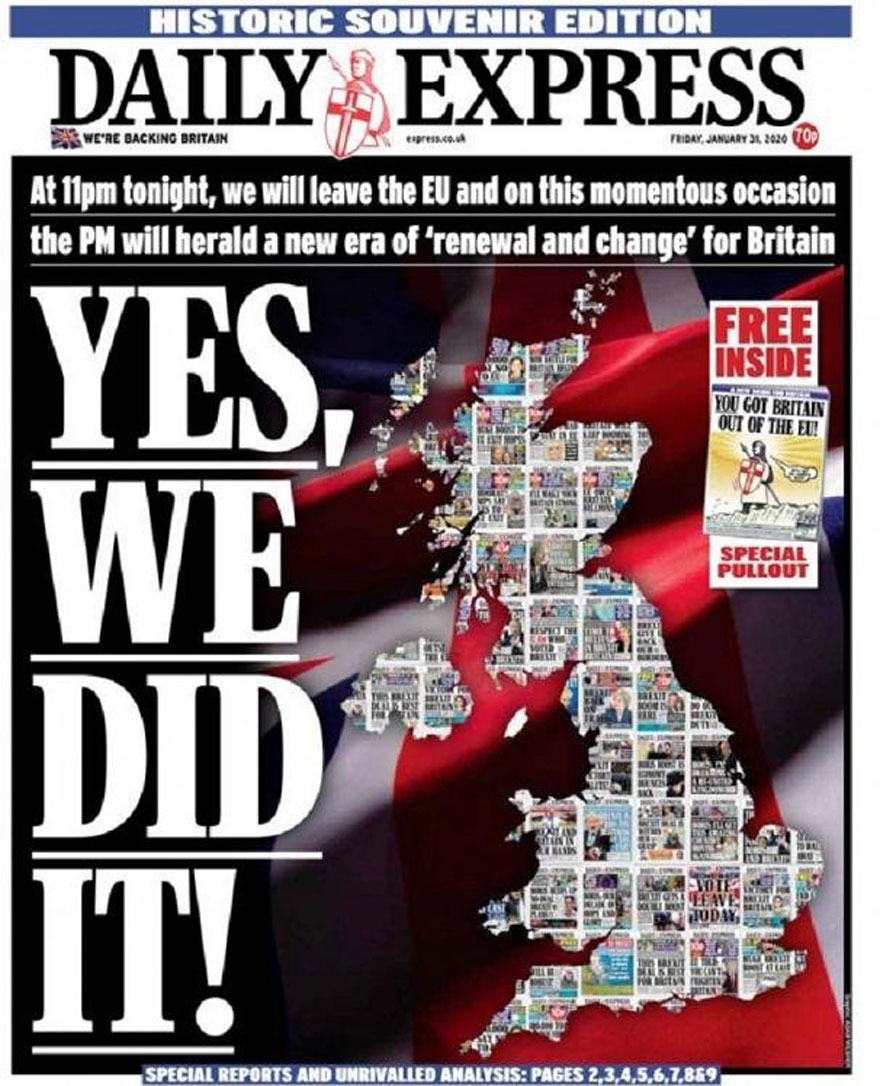 «Νέα αυγή για τη Μεγάλη Βρετανία», είναι ο τίτλος της Daily Mail, μιας άλλης εφημερίδας που είναι υπέρ του Brexit. «Στις 11 το βράδυ το περήφανό έθνος μας θα αποχωρήσει επιτέλους από την ΕΕ-πάντα φίλη με την Ευρώπη, αλλά ελεύθερη και ξανά ανεξάρτητη έπειτα από 47 χρόνια».