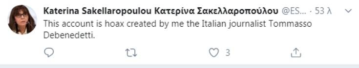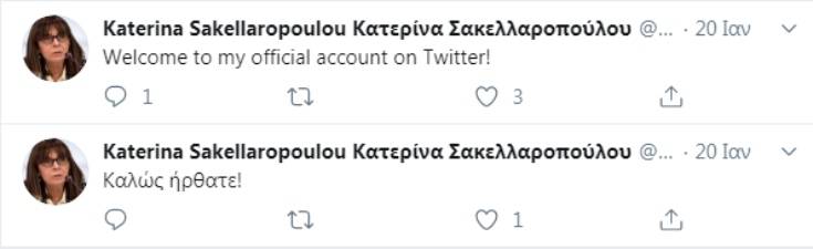 τις προηγούμενες ώρες στο twitter εμφανίστηκε στο twitter ένας λογαριασμός που έφερε το όνομα «Αικατερίνη Σακελλαροπούλου».