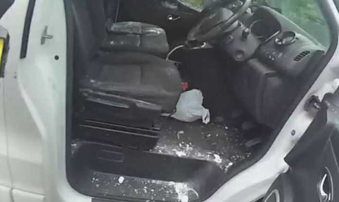 σκίστηκε στα δύο. Σύμφωνα με πληροφορίες, ο άνδρας προσπάθησε να πετάξει το εμπόρευμα από το βαν του. Ωστόσο, το παράθυρό του έκλεισε και έτσι η κοκαΐνη αξίας 25.000 £ έπεσε μέσα στο όχημά του. Όταν λοιπόν οι αξιωματικοί τον πλησίασαν, «περίπου 25.000 λίρες κοκαΐνης» ήταν πεταμένες μέσα στο βαν του.