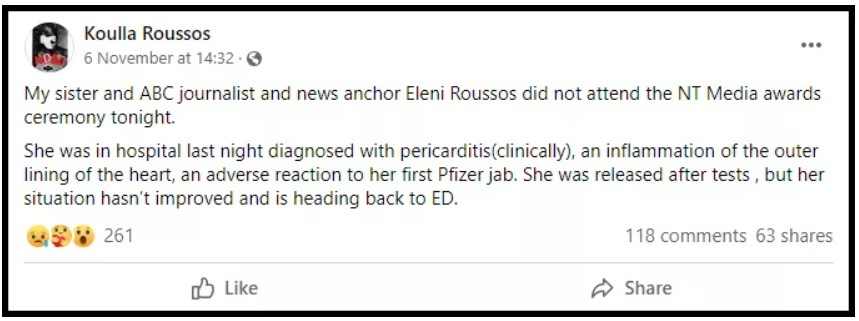 DARWIN - Μια τρίτη Αυστραλή δημοσιογράφος εμφάνισε περικαρδίτιδα (φλεγμονή της καρδιάς) μετά το πρώτο εμβόλιο Pfizer COVID-19. Η Ελένη Ρούσσος, δημοσιογράφος του ABC News και παρουσιάστρια στην αίθουσα ειδήσεων του ABC στο Ντάργουιν, εισήχθη στο νοσοκομείο στις 5 Νοεμβρίου και διαγνώστηκε με περικαρδίτιδα, σύμφωνα με την αδελφή της Κούλλα Ρούσσος.