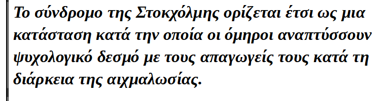 - Η ανάπτυξη θετικών συναισθημάτων από τον όμηρο προς τον απαγωγέα