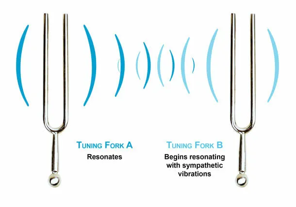 Αυτό παρατηρείται καλύτερα όταν δύο πιρούνια συντονισμού τοποθετούνται κοντά το ένα στο άλλο, αλλά δεν αγγίζουν το ένα το άλλο, και μόνο το ένα πιρούνι χτυπιέται. Το άλλο πιρούνι θα ανταποκριθεί σε μια συχνότητα συντονισμού με το χτυπημένο πιρούνι, με αποτέλεσμα συμπαθητικές δονήσεις. Αυτό παρατηρείται επίσης όταν χτυπάτε μια χορδή μιας κιθάρας και οι άλλες χορδές δονούνται συμπαθητικά μαζί της.