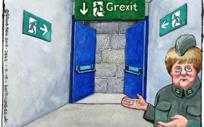 απεικονίζει την πόρτα της εξόδου διάπλατα ανοιχτή και την Άνγκελα Μέρκελ με ύφος απροσδιόριστο να χειρονομεί «ορίστε κύριοι περάστε»...