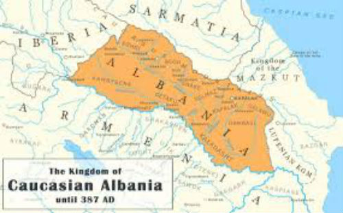 Ὑπόκειται δέ τῆ Σαρματία πρός μέν τῶ Πόντω ἡ Κολχική πρός δέ τῆ Κασπία ἡ Ἀλβανία. Ὁ Πλούταρχος (βίοι παράλληλοι) γράφει: Καταλιπὼν δὲ φρουρὸν Ἀρμενίας Ἀφράνιον αὐτὸς ἐβάδιζε διὰ τῶν περιοικούντων τὸν Καύκασον ἐθνῶν ἀναγκαίως ἐπὶ Μιθριδάτην. Μέγιστα δὲ αὐτῶν ἐστιν ἔθνη Ἀλβανοὶ καὶ Ἴβηρες, Ἴβηρες μὲν ἐπὶ τὰ Μοσχικὰ ὄρη καὶ τὸν Πόντον καθήκοντες, Ἀλβανοὶ δὲ ἐπὶ τὴν ἕω καὶ τὴν Κασπίαν κεκλιμένοι θάλασσαν. Οὗτοι πρῶτον μὲν αἰτοῦντι Πομπηΐῳ δίοδον ἔδοσαν·