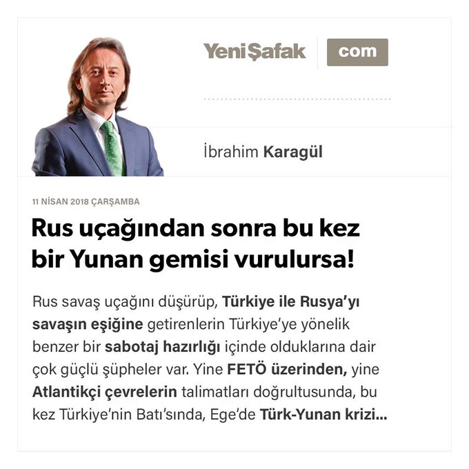 Όπως μεταδίδει ο ΣΚΑΪ από την Τουρκία, στο άρθρο, το οποίο έχει τίτλο «αν χτυπηθεί ένα ελληνικό πλοίο», αναφέρεται στο ενδεχόμενο προβοκάτσιας στο Αιγαίο, έπειτα από την κατάρριψη του ρωσικού μαχητικού από την Τουρκία, το 2013. Στο επεισόδιο με τη Μόσχα η Άγκυρα είχε επιρρίψει τις ευθύνες στους γκιουλενιστές.