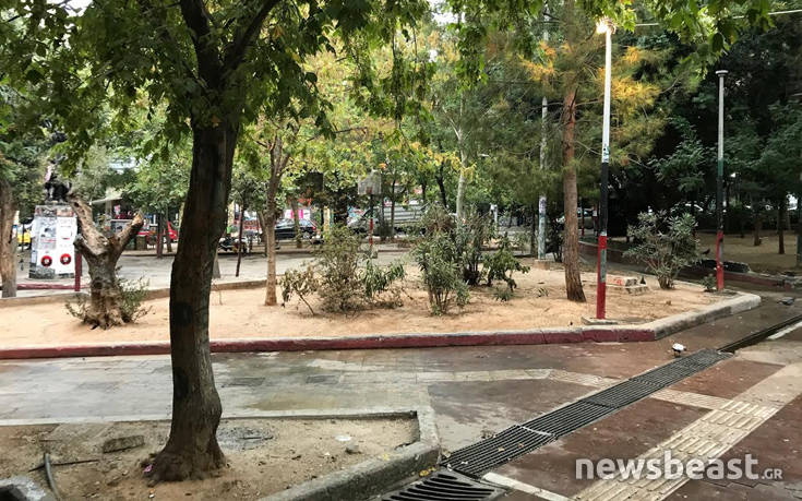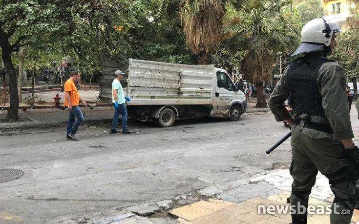 Συνεργεία του δήμου Αθηναίων πραγματοποιούν καθαρισμό, ενίσχυση φωτισμού και άλλες παρεμβάσεις στην πλατεία και τη γύρω περιοχή.