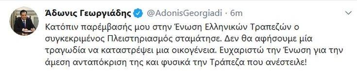 Λίγο αργότερα ο υπουργός Ανάπτυξης Άδωνις Γεωργιάδης γνωστοποίησε μέσω Twitter πως με παρέμβασή του στην Ένωση Ελληνικών Τραπεζών ο πλειστηριασμός σταμάτησε.